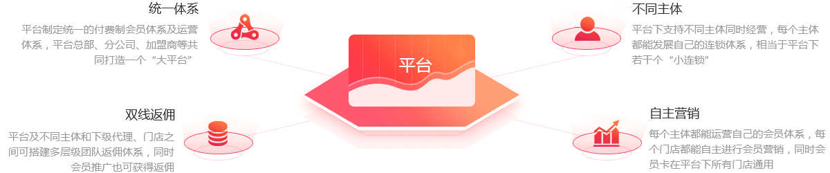 平臺支持不同主體同時經(jīng)營,每個主體都能自主運營自己的會員,實現(xiàn)多品牌萬店連鎖運營,相當于4.0版本里可內(nèi)嵌若干個3.0版本,同時升級為四合