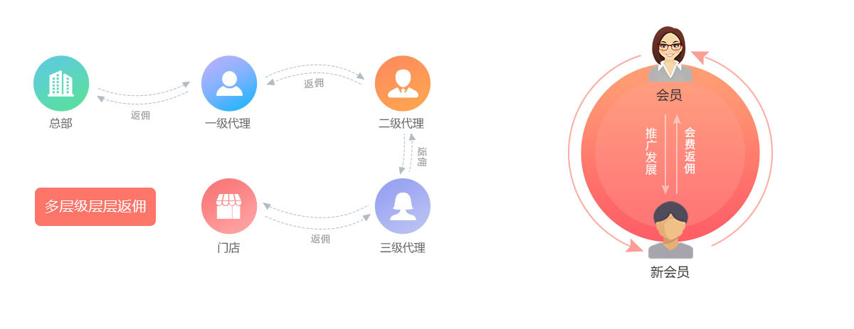 大平臺下支持不同區(qū)域、不同主體同時經(jīng)營,每個主體可以開發(fā)直營門店,也可以發(fā)展自己的代理加盟體系,通過返傭方式讓